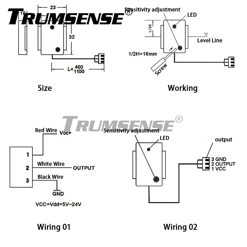 This non-contact liquid level sensor operates with a wide voltage range of 5 to 24V DC. The switch output voltage is equal to the supply voltage. The connected device port must be able to withstand this voltage to avoid damage.