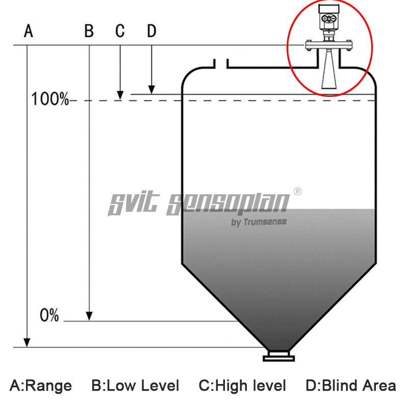 Note: Make sure the radar level meter the highest level cannot enter the measuring blind area (Figure D shown below).