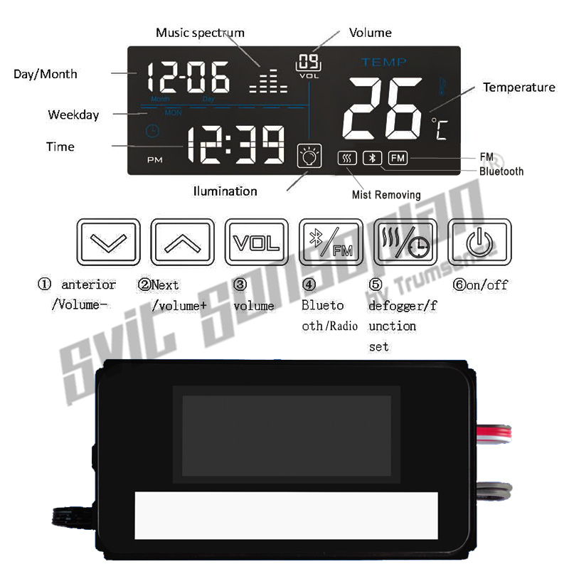 The anti-fog function can drive a relay to realize the on/off control of the anti-fog film. At the same time, it has a built-in Bluetooth receiving module and a class D audio amplifier, providing an output power of 3W/4Ω × 2. Connect the matching K15 speaker to form a high-quality Bluetooth speaker , and you can control volume and song selection by touching the buttons. With a liquid crystal display, it can display the time, date, day of the week, room temperature, etc., as well as switch status and Bluetooth status. K3015CAS supports 12-hour/24-hour switching, and Celsius/Fahrenheit temperature switching.