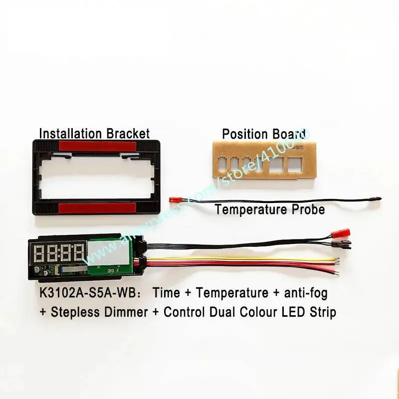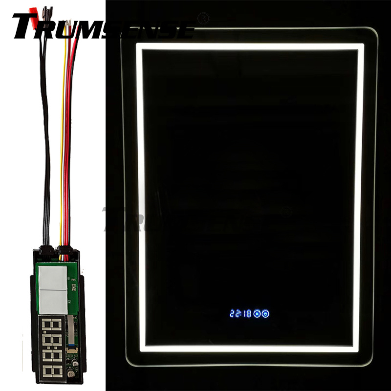 K3102A is a two-button touch controller. It is installed on the glass mirror to realize touch operation. It provides a switch with a current carrying current of 3.5A, which can be connected to LED lighting. Another output is 1.2A, which can be used for anti-fog control. With a digital tube display, it can display content such as time and indoor temperature; 12 or 24-hour format, Celsius or Fahrenheit temperature units can be set by yourself; two-color button backlight can display the current switch status.