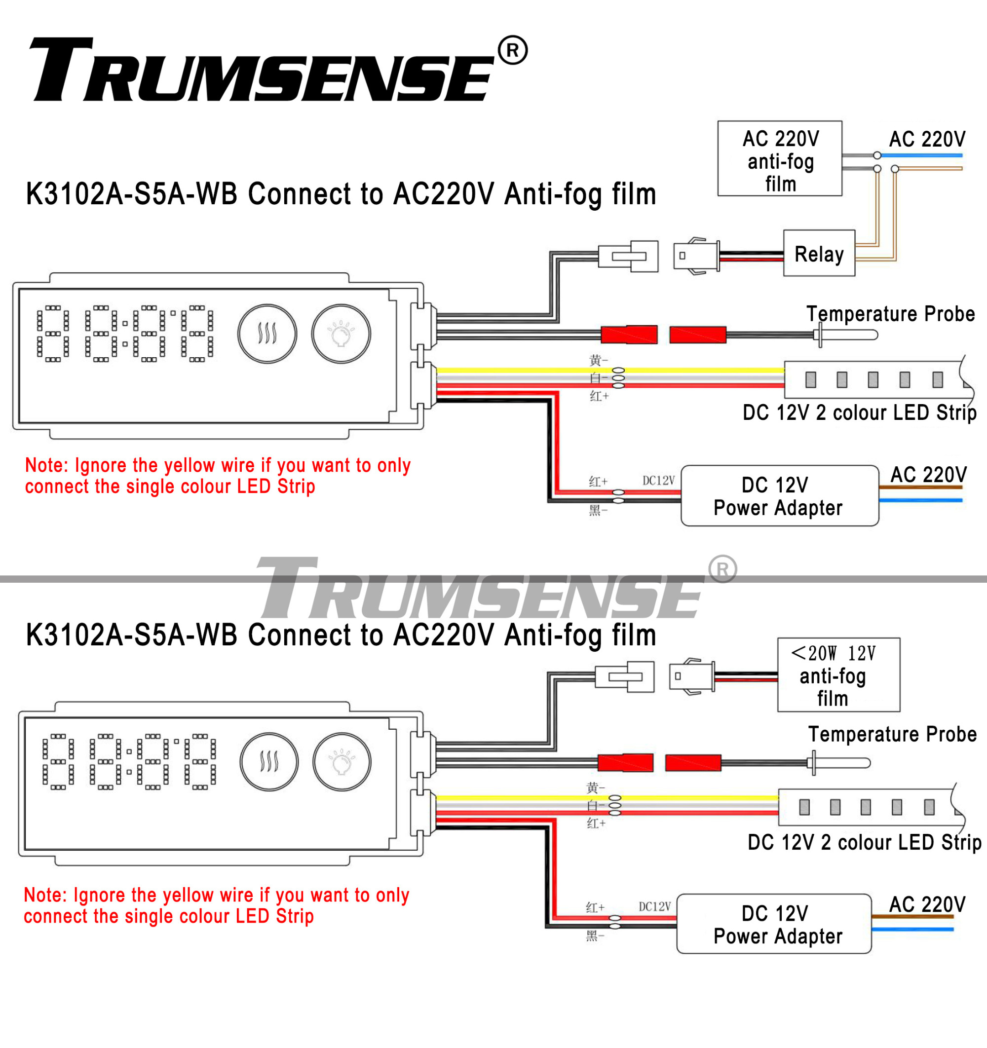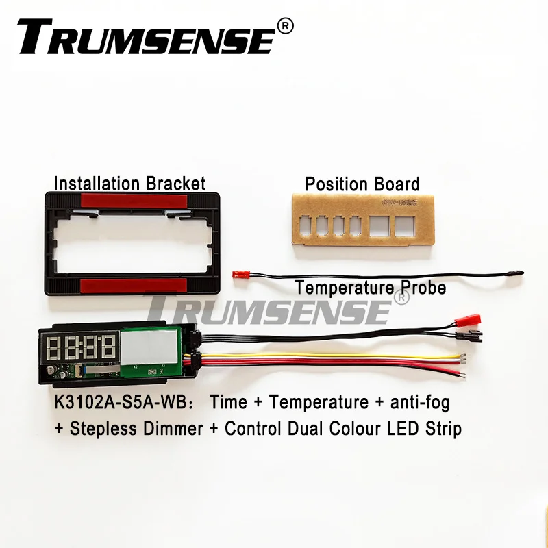 Multiple functional models available,the design of K3102A-S5A-WB includes general switch function, stepless brightness adjustment, control dual colour LED strip,mist removing film on off controlling.