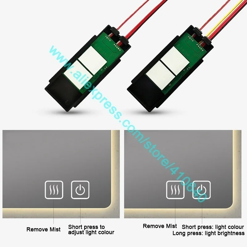 This product is a double key touch switch, suitable for installation behind the mirror to achieve mirror touch operation. K1 is the light control switch, which can select the functions of light switch, brightness adjustment, and color temperature adjustment. K2 is an antifogging control switch, which can directly control the low voltage DC antifogging film or control the high voltage antifogging film by relay.