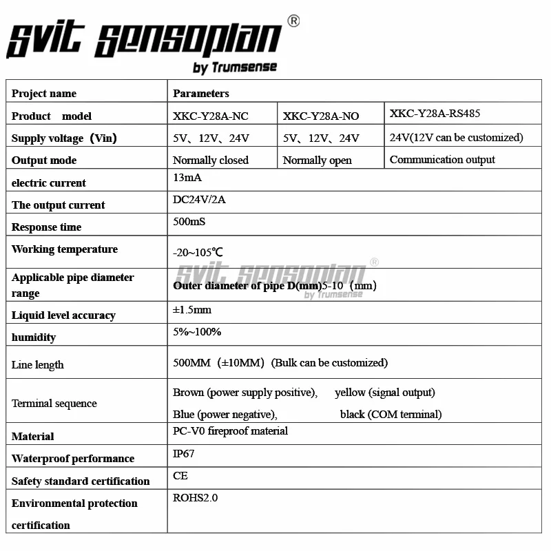 XKC-Y28A-xxx series products are specially developed for liquid level detection in non-metallic pipelines. This series of liquid level sensors supports three signal output interfaces, namely high and low level output interface, NPN output interface, and PNP output interface; the output methods of the three models correspond to the following three models: