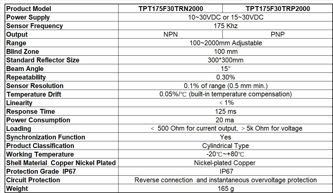 2: Parameter Table of Trumsense TPT175F30TRN2000 Ultrasonic Distance / Liquid Level / Powder Sensor: